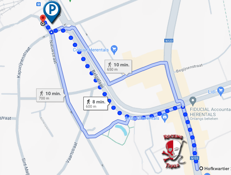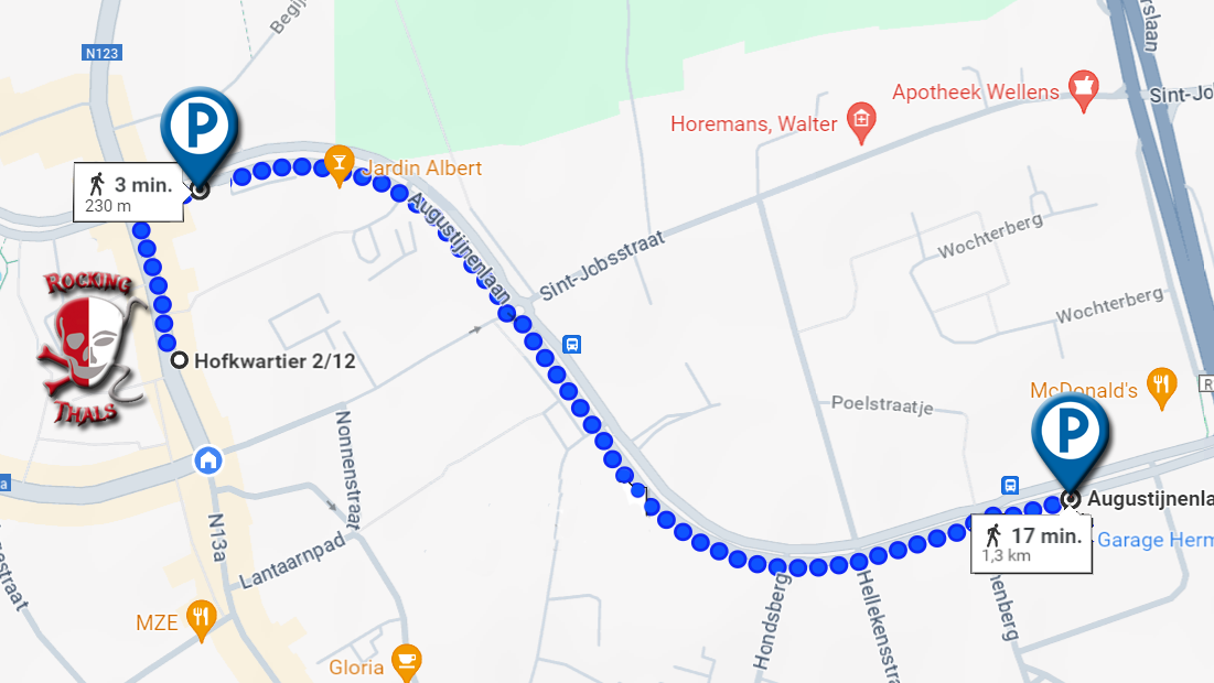 Naast de weg kan je gratis parkeren op heel de Augustijnenlaan. Het is ongeveer 3min tot 18min wandelen tot op "Rocking Thals", afhankelijk waar je staat.