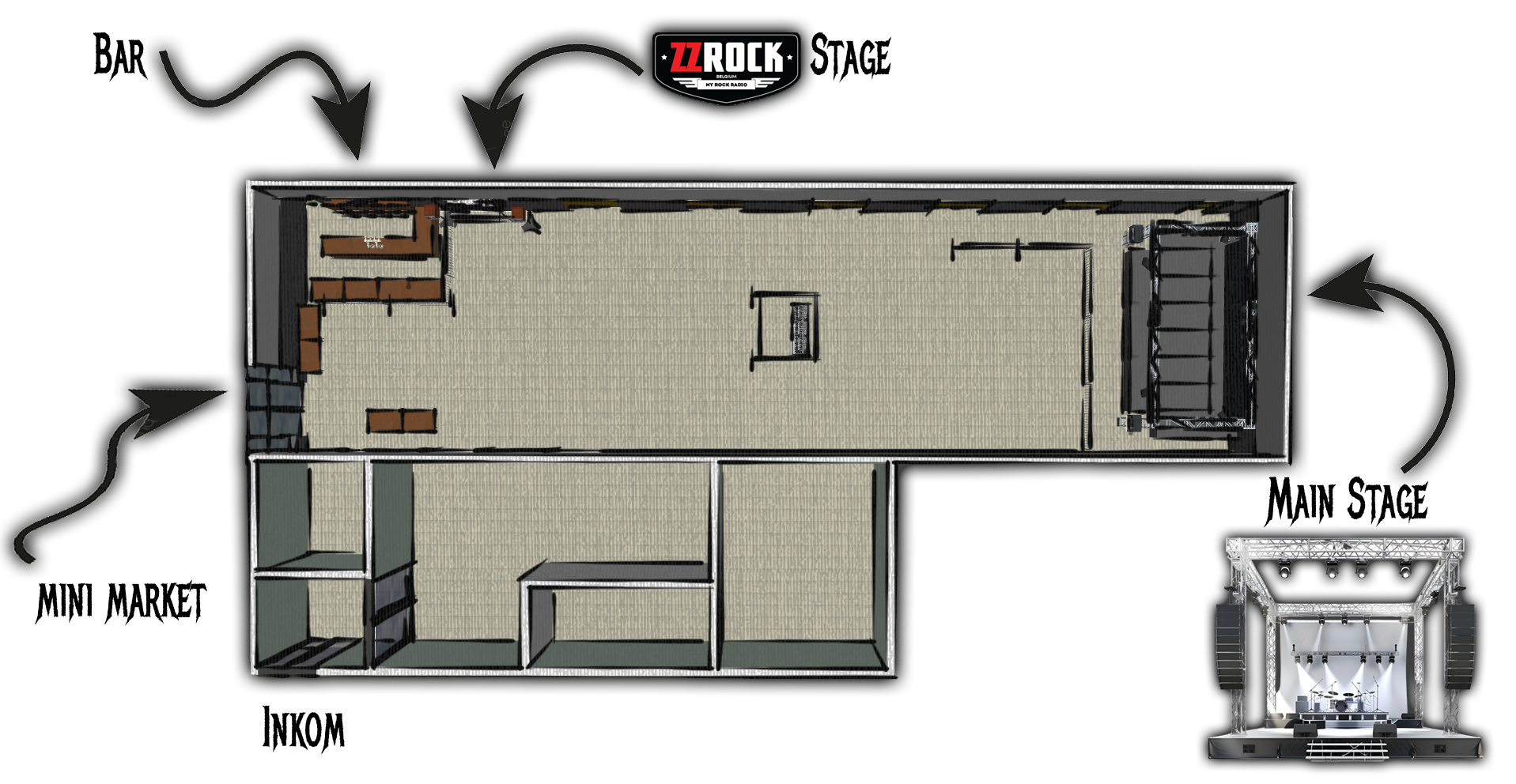 "ZZRock Stage": Het podium waar tussen de bands oa interviews zullen afgenomen zullen worden, tombola voorzien zal worden, waar achtergrond muziek zal te horen zijn en zoveel meer!