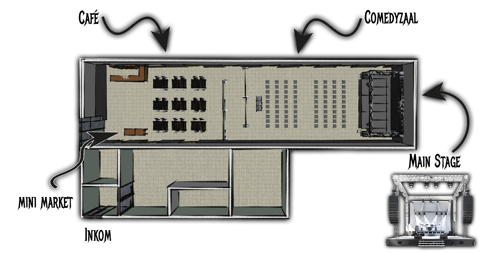 "Café": Eén uur voor de show zal het café al opengaan om al iets te komen drinken. Ook tijdens de pauze en na de show is het café nog geopend. Tijdens de show is het café gesloten!